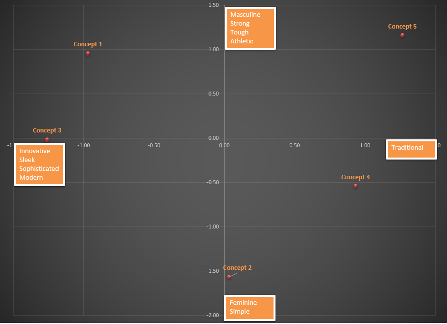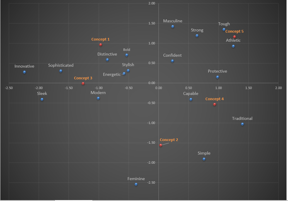 Figure 2 shows a map that captures the locations of the concepts relative to the axes, but now the axes have been defined based on the output of the correspondence analysis. The horizontal axis clearly captures the “traditional-to-modern” continuum whereas the vertical axis captures a “feminine-to-masculine” continuum. This makes it easy to see that both Concept 1 and Concept 5 are viewed as tough and masculine, but the former is also perceived as modern and innovative whereas the latter is perceived as traditional. This clarity is lost in the map on figure 1. I don’t know about you, but the map in figure 2 sparks joy in me, the one in figure 1 does not!